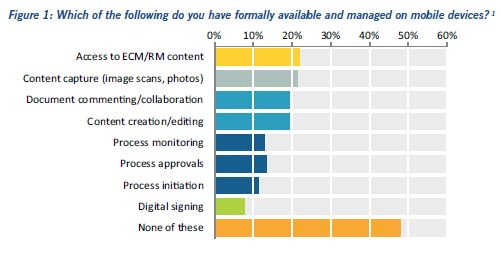 In the AIIM industry watch report titled State of the Industry 2016, research finds that 60% of respondents say they embrace content access on mobile. However, there is a degree of disconnect between personal willingness to access content on mobile devices and corporate policy. Nearly 60% of respondents say they embrace content access on mobile, but only 43% have departmental support, and 31% company-wide support. In practice, only 22% have mobile access to ECM/RM systems, a dismal turnout, with the majority of workers and businesses today missing out on mobile benefits. (Figure 1)