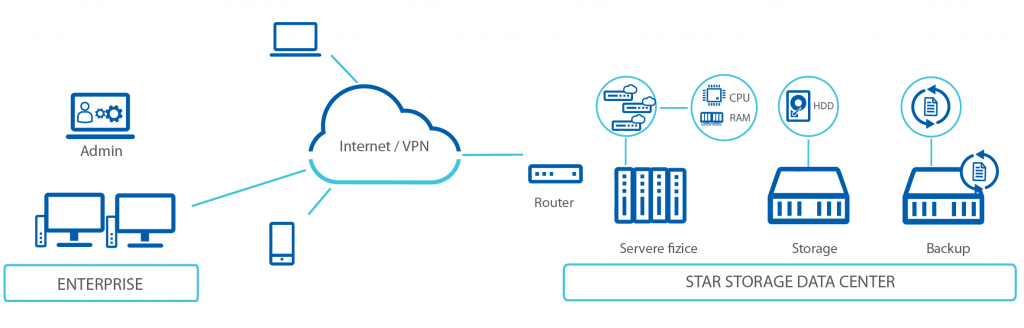 Star Storage will provide resources for virtual platform on equipment installed in Star Storage Data Center in Bucharest. Virtualized platform operates in a private cloud environment, therefore hardware resources are dedicated. Platform is designed for maximum availability, scalability and performance, so all systems are duplicated and interconnected in order to avoid dependence on a single element (single point of failure).